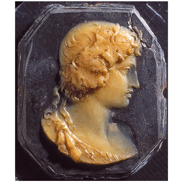 Il modello riprende la statua di Antinoo come Dioniso rinvenuta a Palestrina e ora nei Musei Vaticani. Si tratta di una cera quasi identica ma speculare rispetto a quella cat. n. 296, rappresentata volta a sinistra, che fu utilizzata dal Pistrucci per la realizzazione di un cammeo. Lavoro non ultimato