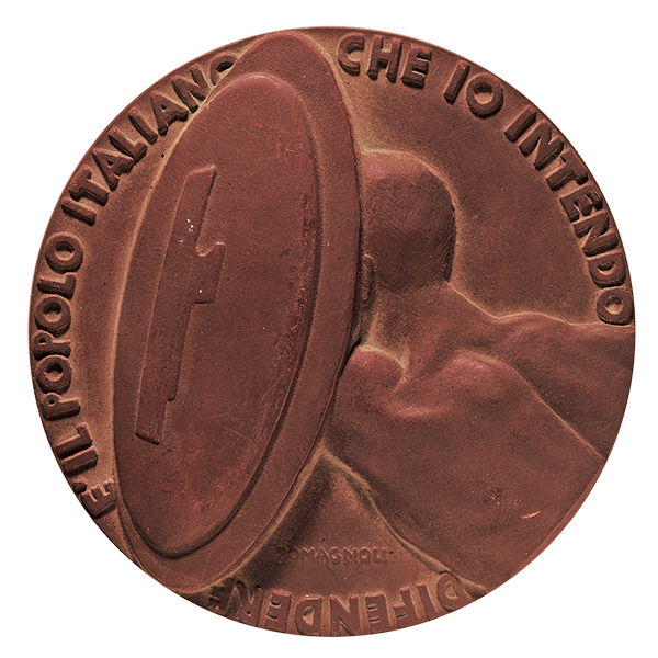 Un uomo in nudità eroica regge sollevato uno scudo, sul quale è inciso un fascio littorio; sotto, ROMAGNOLI