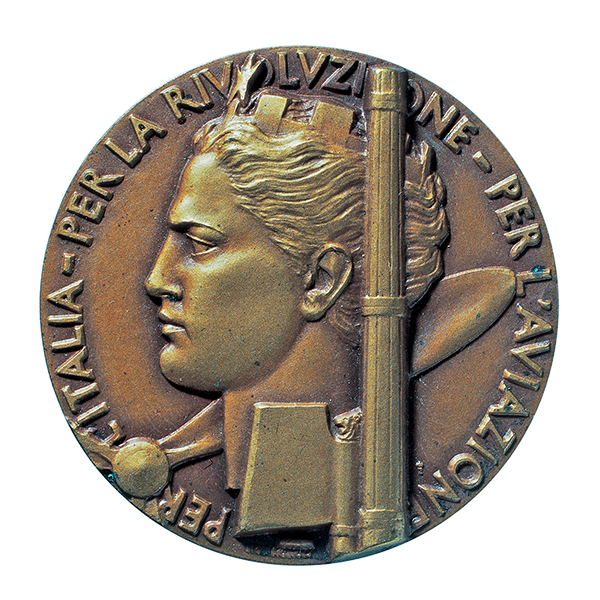 Testa turrita dell'Italia a s.; davanti, elica; dietro, fascio littorio; in basso, ROMAGNOLI
