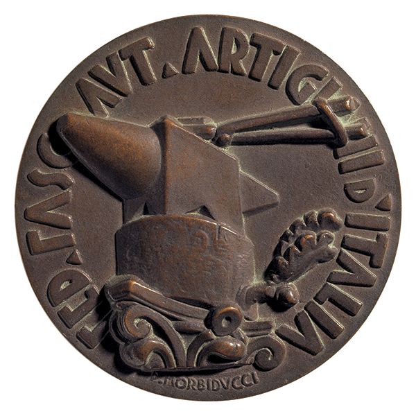Su di un capitello, incudine e tenaglie, simboli del lavoro artigianale; in basso, lungo il bordo, P . MORBIDVCCI