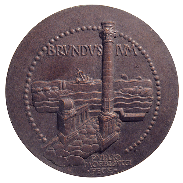 Veduta del porto di Brindisi e del tratto di via Appia che vi giunge; sopra, leggenda; sotto, su tre righe, PVBLIO / MORBIDVCCI / • FECE •