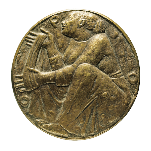 Donna che fila la lana, seduta a s.; intorno, O . P . O .