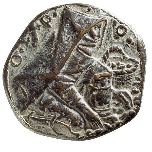 Figura con cappuccio e mantello che raccoglie ghiande, inginocchiata a d.; accanto, cesto; intorno, O . P . O .