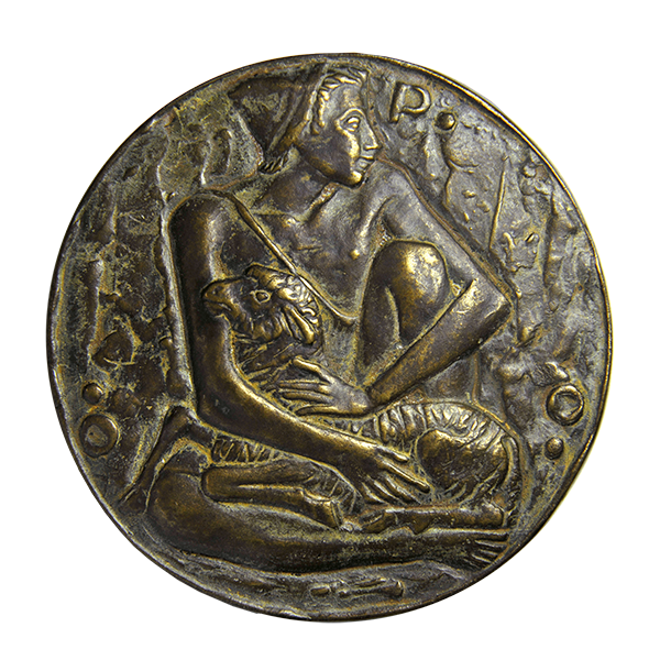 Un pastore, seduto di fronte, con testa rivolta a d., tiene tra le gambe una pecora; intorno, O . P . O .
