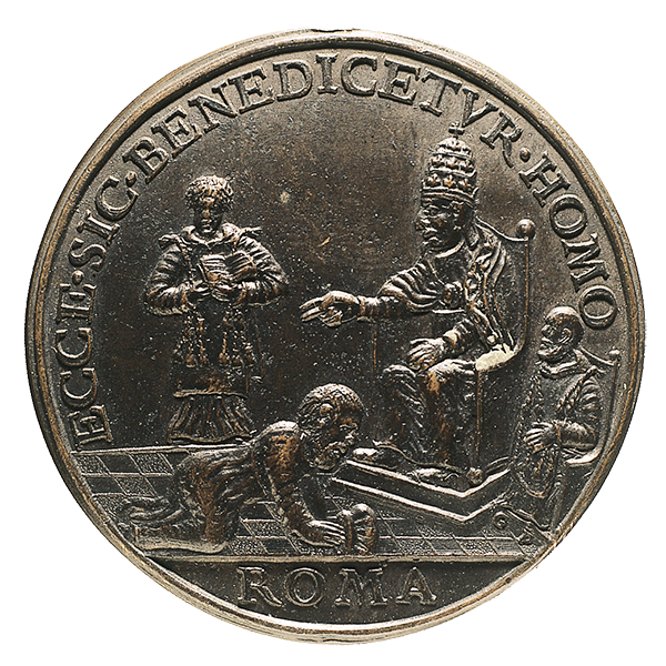 Il Pontefice in trono benedicente; a s., personaggio inginocchiato; a d., prelato seduto, sotto la sedia, G P; in esergo, ROMA