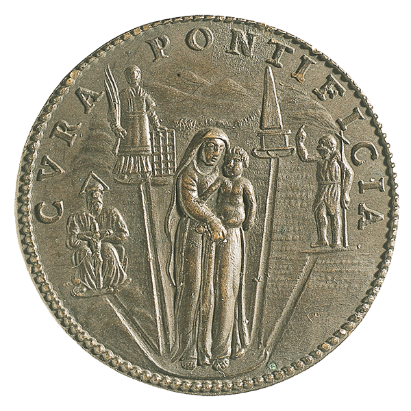 Sisto V (1885-1890). Medaglia in bronzo con al rovescio una rappresentazione schematica del nuovo assetto viario convergente sulla Basilica Liberiana
