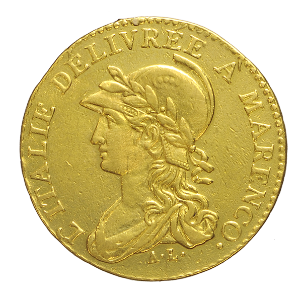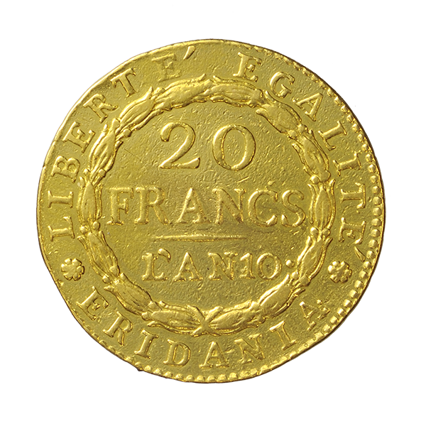 Nel campo, su quattro righe entro corona di alloro, 20 / FRANCS / - / L'AN 10 •