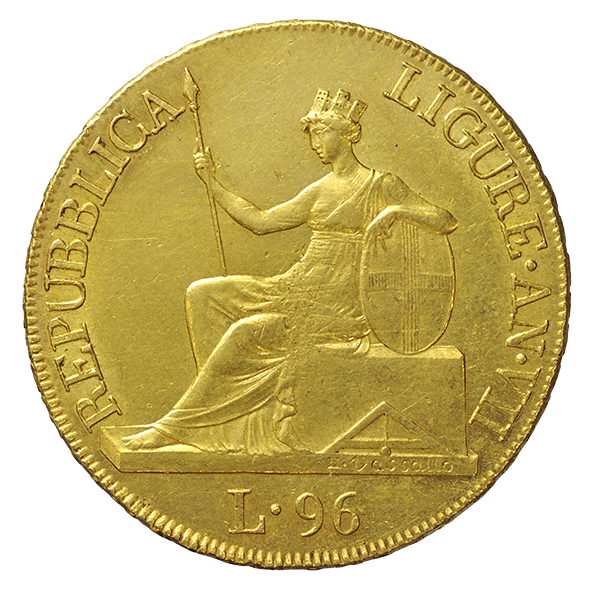 La personificazione turrita della Repubblica Ligure seduta a sinistra con lancia e scudo; sul basamento, H • VASSALLO; sotto, L • 96
