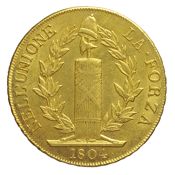 Fascio tra due rami di alloro e sormontato da pileo; sotto, 1804