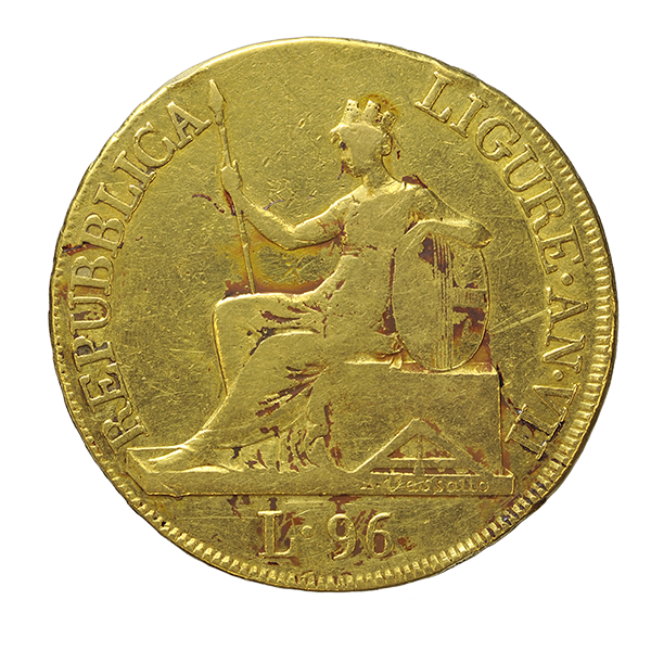 La personificazione turrita della Repubblica Ligure seduta a sinistra con lancia e scudo; sul basamento, H • VASSALLO; sotto, L • 96