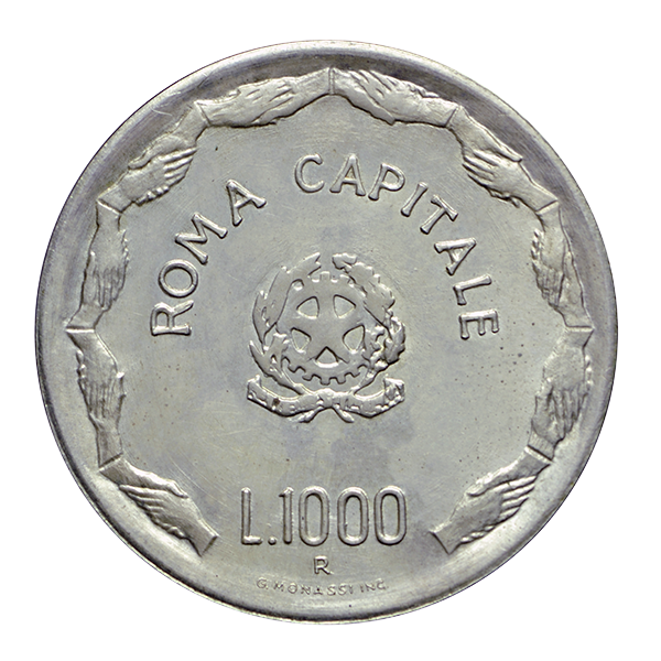 Entro corona di mani, stemma della Repubblica Italiana; sopra, ROMA CAPITALE; sotto, su due righe, L . 1000 / R; in basso, lungo il bordo, G . MONASSI INC .