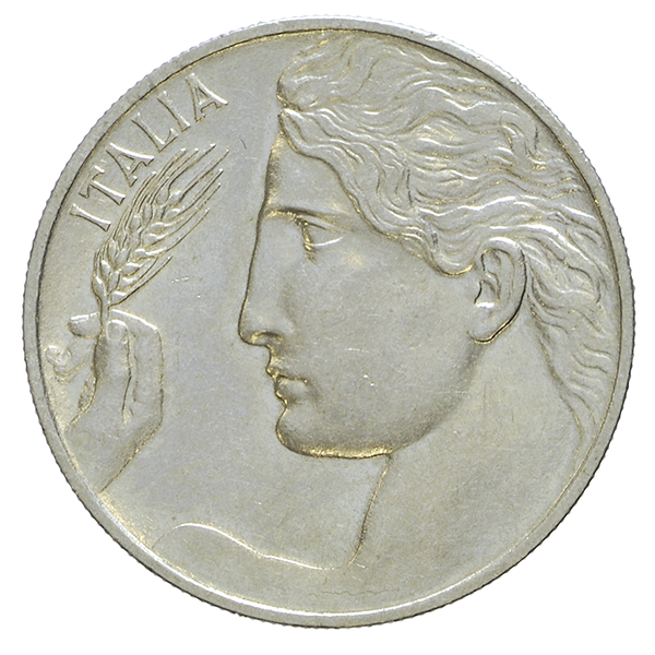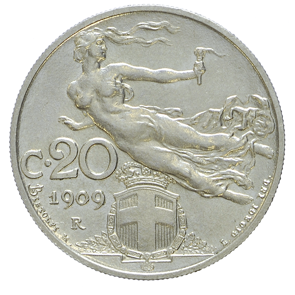 L'Italia/Libertà librata in volo verso s. con fiaccola stretta nella mano d.; sotto, stemma Savoia coronato e ornato dal Collare dell’Annunziata; nel campo a s., C • 20 / 1909 / R; ai lati, lungo il bordo, L BISTOLFI M . - L . GIORGI INC .