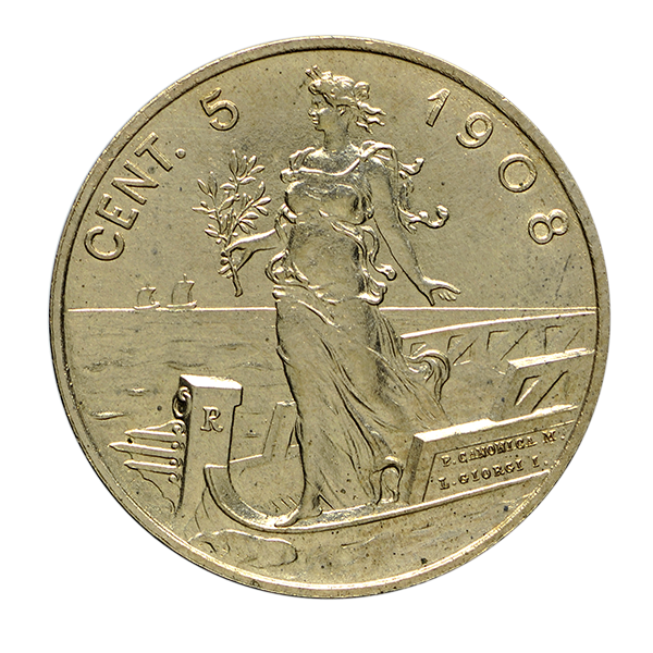 L’Italia su prua di nave a s., stringe nella mano d. un ramo di alloro; sul dritto di prua, R; sul parapetto, P . CANONICA M . / L . GIORGI I .